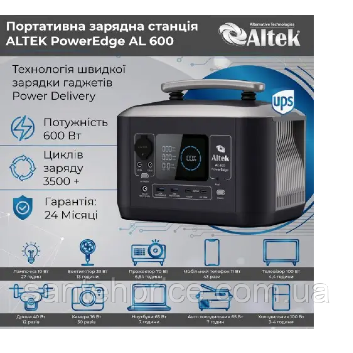 ALTEK PowerEdge AL 600 – портативна станція, яка буде незамінною за відсутності електропостачання у приватних будинках, квартирах, на дачі, офісних приміщеннях, у польових умовах, під час активного відпочинку на природі, а також у подорожах. Сумісна з більшістю електронних пристроїв, таких як дрони, ноутбуки, ліхтарі, смартфони, планшети, камери, рації, мережеве обладнання, світлодіодні лампи, холодильники, телевізори та ще безліч інших пристроїв. розуму, перенапруги, низької напруги, перевантаження, перегріву.