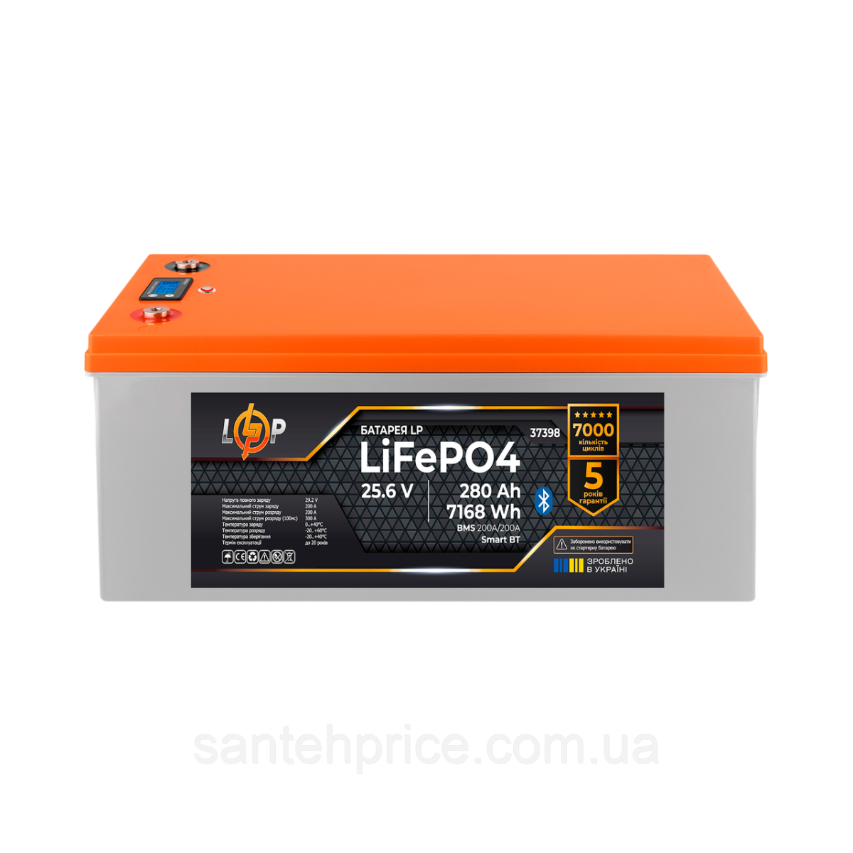 Забудьте про блекаути з літій-залізо-фосфатними (LiFePO4) акумулятором Акумулятор підходить для роботи з ДБЖ Акумулятор LP LiFePO4 25,6V - 280 Ah (7168Wh) (BMS 200A/200А) LCD Smart BT Максимум енергії для комфортного життя Час до повного заряду батареї від 2 годин. Більше ніж 5 годин автономного живлення для вашої техніки. 15 років ефективного використання. *Час заряду може змінюватись в залежності від струму заряду. Літієві батареї LiFePO4 українського бренду LogicPower забезпечують надійну та безпечну роботу для систем резервного живлення різної потужності. Кожна модель наших акумуляторів оснащена передовою системою управління батареями (BMS). Це гарантує максимальну ефективність, довговічність і безпеку в експлуатації. Переваги літієвого акумулятора LiFePO4 Швидке заряджання та відсутність ефекту пам“яті: Літієві акумулятори заряджаються значно швидше, ніж свинцево-кислотні. Відсутність ефекту пам“яті означає, що акумулятор можна заряджати та розряджати за будь-якого рівня зарядки без втрати ємності. Акумулятори LiFePO4 заряджаються з максимально рекомендованим струмом 0,5С, де С - ємність акумулятора. Для акумулятора LP LiFePO4 25,6V - 280 Ah номінальний струм заряду не повинен перевищувати 140 А (0,5 x 280 Ач). Важливо, щоб цей струм не перевищував BMS, щоб зберегти безпеку та продовжити термін служби акумулятора. Довговічність: АКБ LiFePO4 мають величезний термін служби. Вони здатні витримати до 7000 циклів розрядки й зарядки, що в рази перевищує термін служби свинцево-кислотних акумуляторів. Наприклад, літієвий акумулятор для ДБЖ (UPS) ефективно працюватиме понад 10 років. Безпека та екологічність: Технологія виготовлення літій-залізо-фосфату забезпечує високу стабільність і безпеку акумулятора. Термічна та хімічна стабільність - ключова особливість LiFePO4. Даний тип акумуляторів має значну перевагу в частині безпеки порівняно з іншими типами літієвих батарей. Вбудована система управління батареєю (BMS) захищає від перезаряду, перерозряду, перегріву та короткого замикання. Наприклад, використання таких акумуляторів у домашніх системах резервного живлення мінімізує ризик виникнення пожеж. Літієвий акумулятор для котла має низьку токсичність, що робить їхнє використання та утилізацію безпечною для довкілля. Компактні розміри: Літієві акумулятори легші та компактніші за свинцево-кислотні. Це спрощує їх транспортування та встановлення. Низький рівень саморозряду: Літієві акумулятори LiFePO4 мають низький рівень саморозряду, що дає змогу зберігати заряд під час простоїв без необхідності підзарядки. Енергоефективність: Висока щільність енергії дає змогу літієвій батареї зберігати більше енергії в меншому об“ємі, порівнюючи зі свинцево-кислотними акумуляторами. Де використовують літієвий (LiFePO4) акумулятор 25,6В в Україні? Резервне живлення для дому та квартири У разі відключення електроенергії, літієві акумулятори LiFePO4, можуть підтримувати роботу побутових приладів: Освітлення: Основне або аварійне освітлення в будинку. Побутова електроніка: Телевізори, холодильники, комп`ютери, роутери. Портативні зарядні станції: Для заряджання мобільних телефонів, ноутбуків та інших пристроїв. Системи резервного живлення Літієві акумулятори LiFePO4 широко використовуються в системах резервного живлення для критично важливого обладнання: Забезпечують безперебійне живлення серверів і мережево