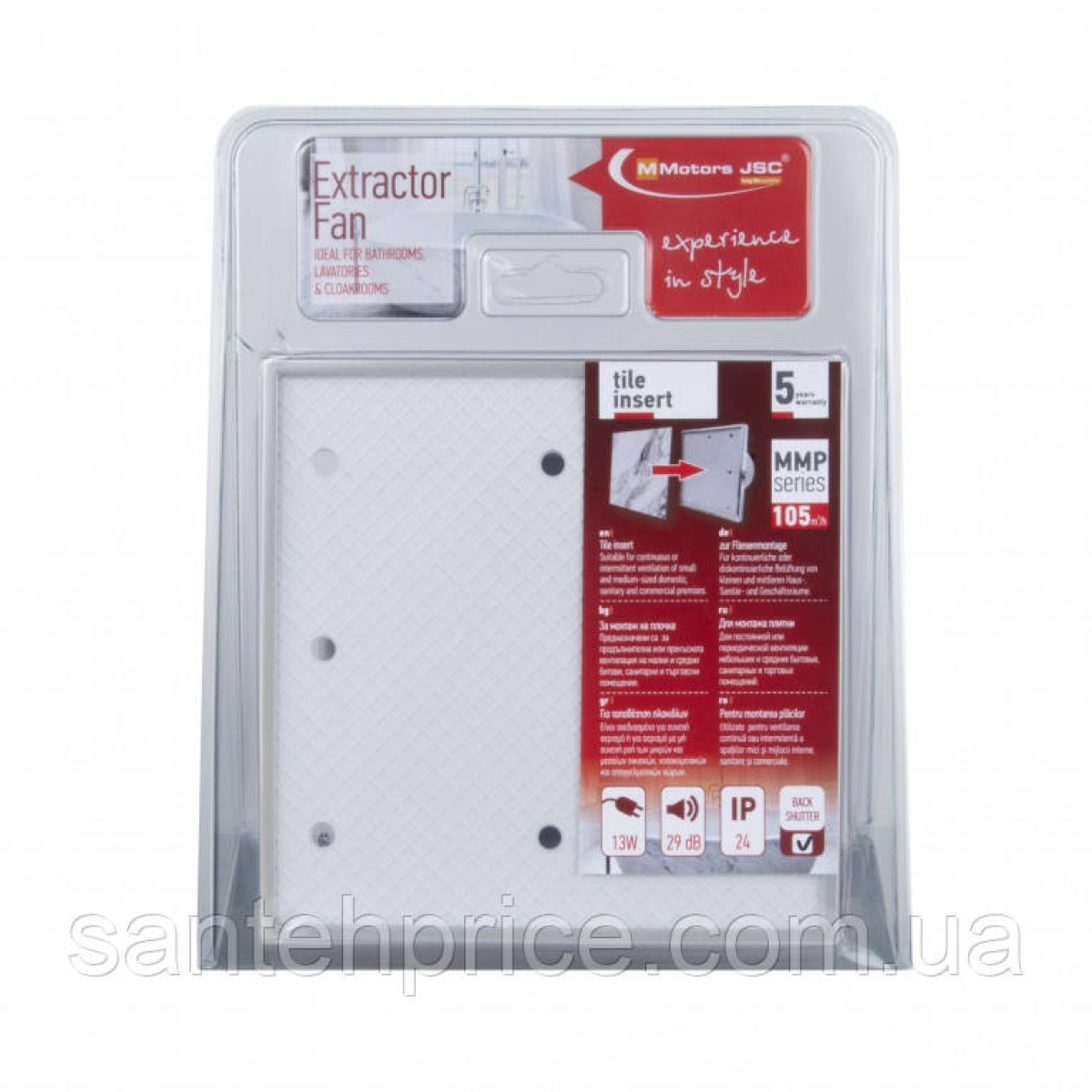 Особливістю цього вентилятора є фронтальна панель, на яку ви можете наклеїти власну декоративну плитку розміром 155×155 мм. Зверху вона фіксується рамкою розміром 160×160 мм, що дозволяє гармонійно інтегрувати пристрій у будь-який інтер’єр без необхідності підбору кольору вентилятора під дизайн приміщення.